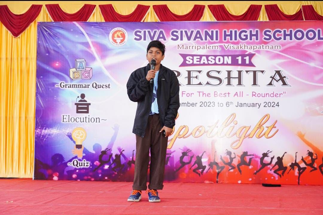 Siva Sivani High School conducts a unique programme called Sreshta for students of Classes VII to X every year. A total of six competitions are conducted class wise over a period of 4 - 6 weeks to identify the best all-rounder from each class. Events include academic and co-curricular competitions. The final event is the hugely popular talent show. The best performers from each section are chosen to present their act/talent/performance to the audience with a time limit of 2 minutes each. The points secured by students in all the six events are totaled and the highest scorer is declared as the Sreshta of the class for the year. Students work hard for this title and intense competition is witnessed throughout this event.